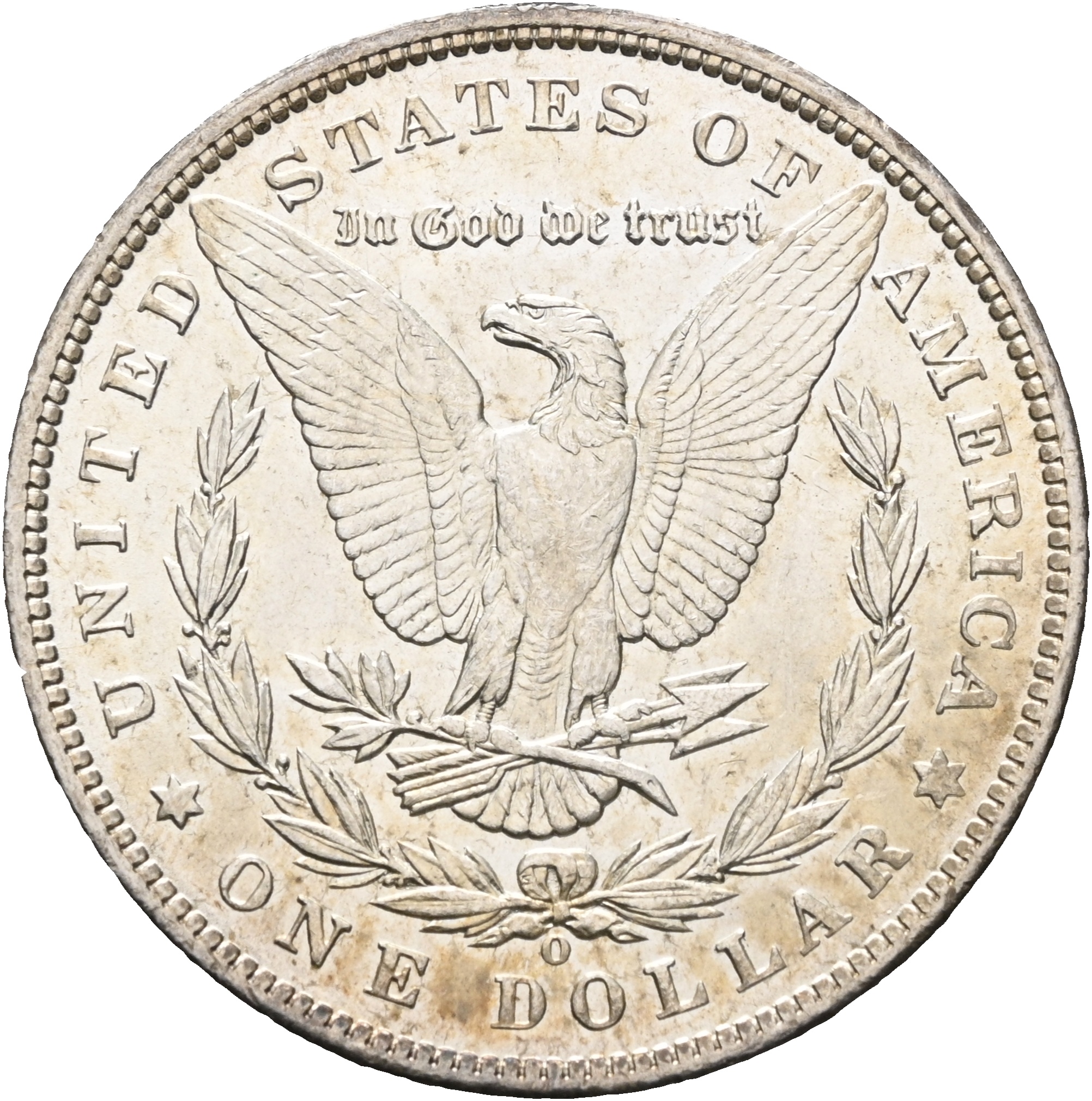 Reversen viser den amerikanske ørnen med utstrakte vinger, omgitt av laurbærkrans og nasjonale inskripsjoner. Mottoet E Pluribus Unum (“av mange, én”) viser til unionens sammensetning, mens In God We Trust ble innført på amerikanske mynter etter borgerkrigen og reflekterer samtidens religiøse og politiske strømninger.