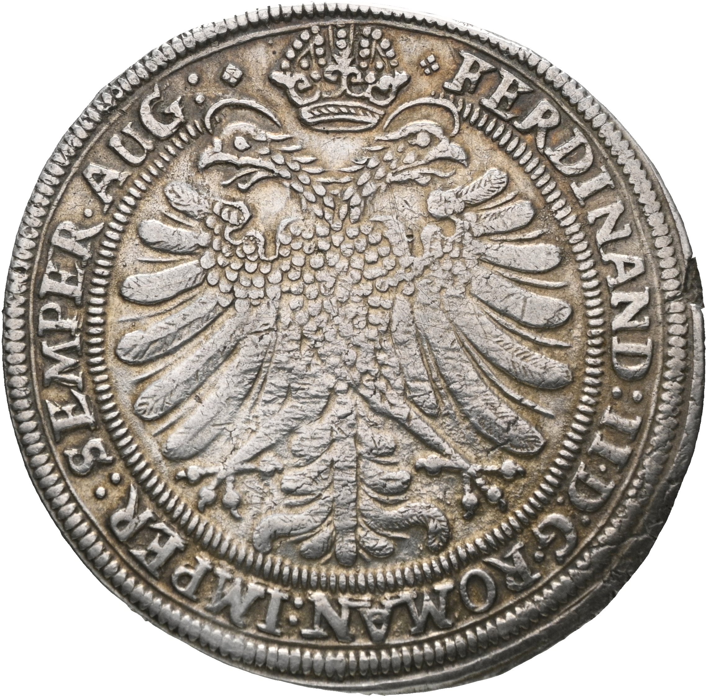 Preget i den frie riksstaden Nürnberg under keiser Ferdinand II. Som selvstendig riksstad i det tysk-romerske riket hadde Nürnberg egen myntrett og preget mynter i keiserens navn, noe som reflekterer rikets desentraliserte struktur.