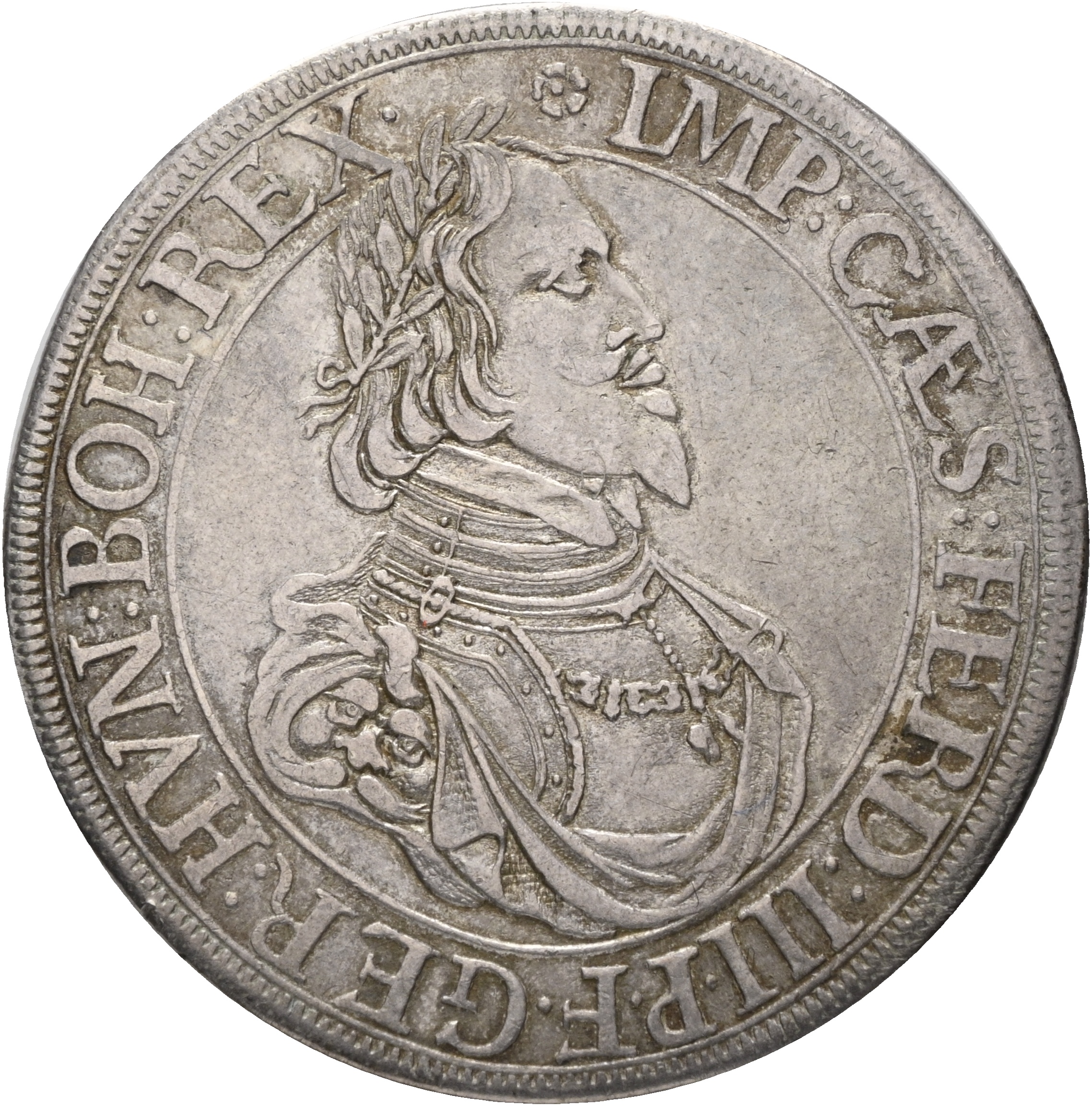 Thaleren ble preget under Ferdinand III, som regjerte midt i trettiårskrigens siste og mest ødeleggende fase — freden i Westfalen kom først i 1648. Forsiden viser byens vedtatte bilde i barokt ornamentramme med byens symbol, konglekotten, i midten; baksiden bærer keiserens pansrede portrett med den fulle keiserlige tittel.