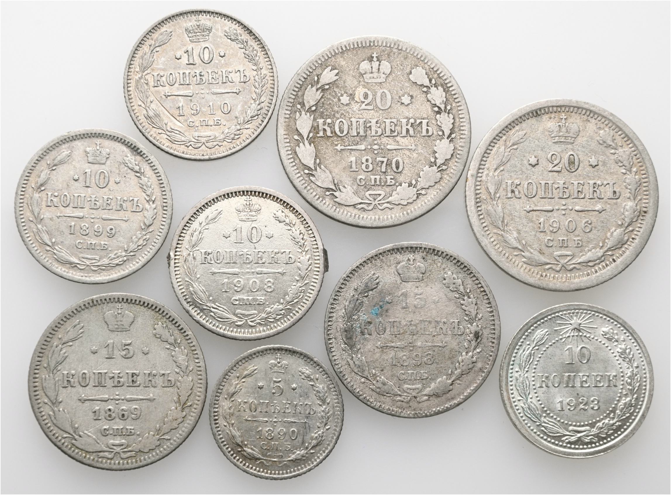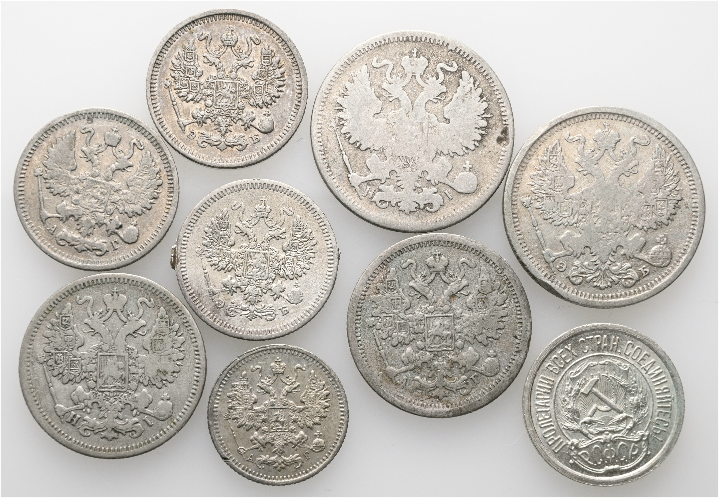 1869-1923 Russland og Sovjet 5, 10, 15, 20 kopek, lott 9 stk., VK