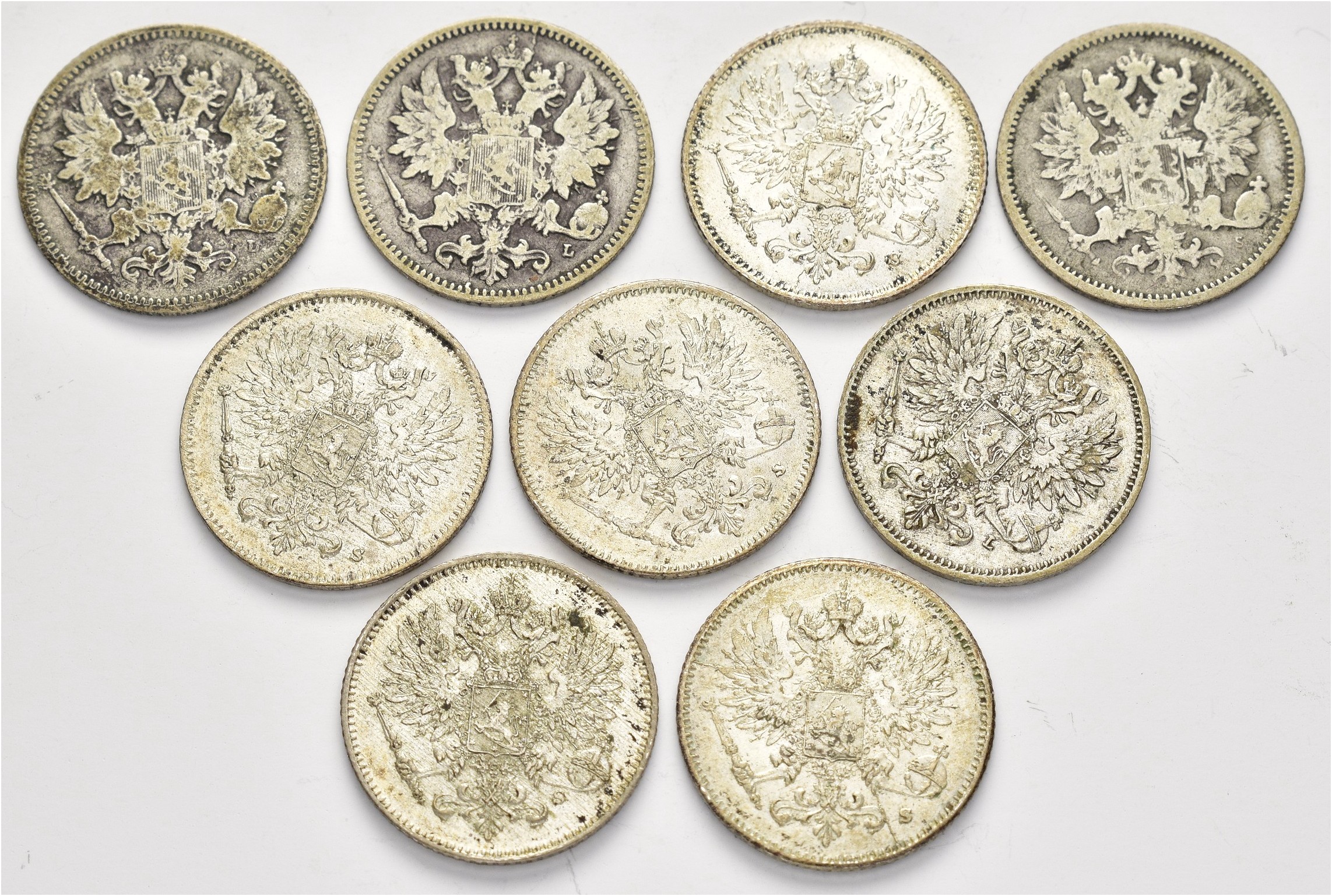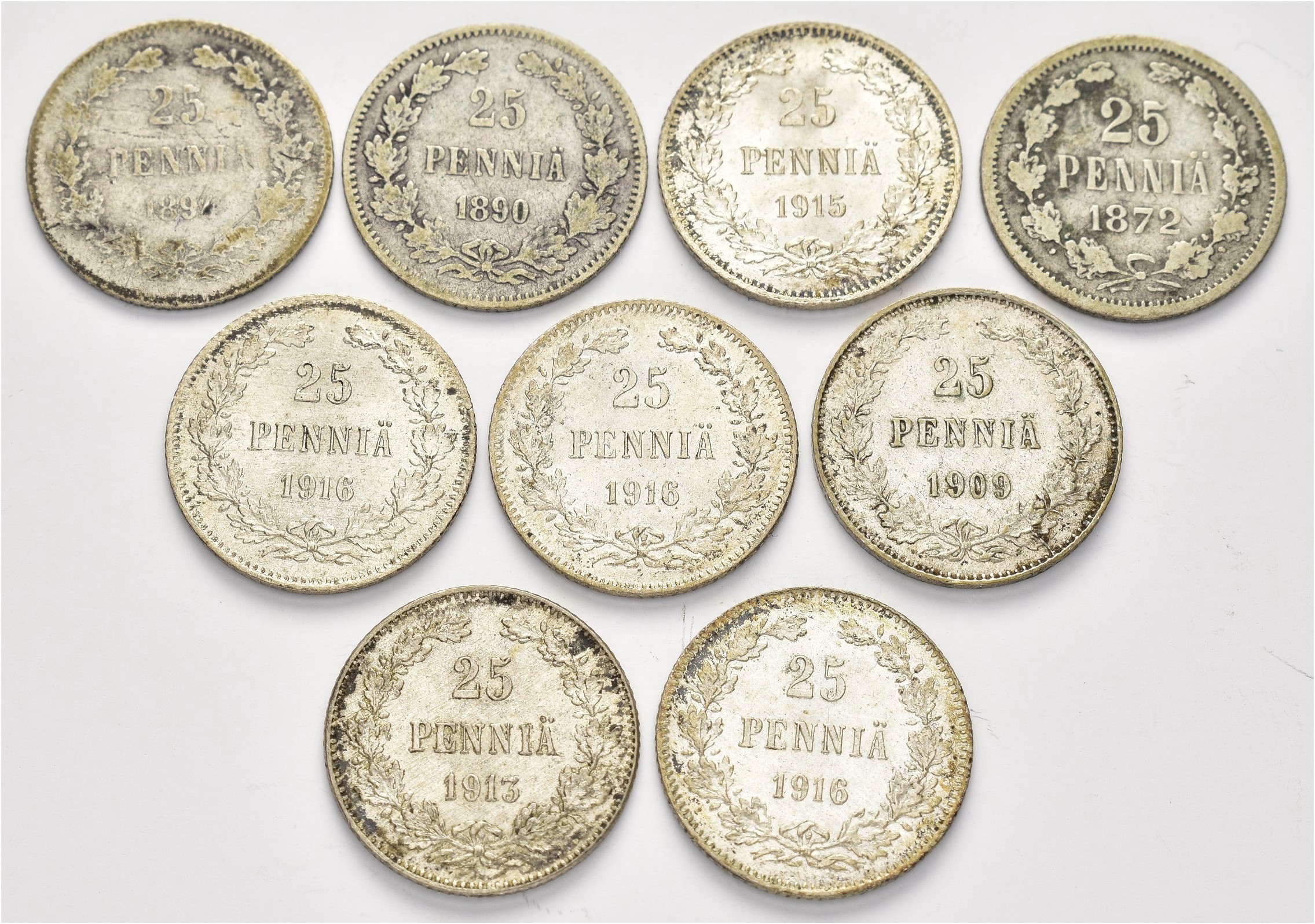 1872-1916 Finland 25 penni, lott 9 stk., VK