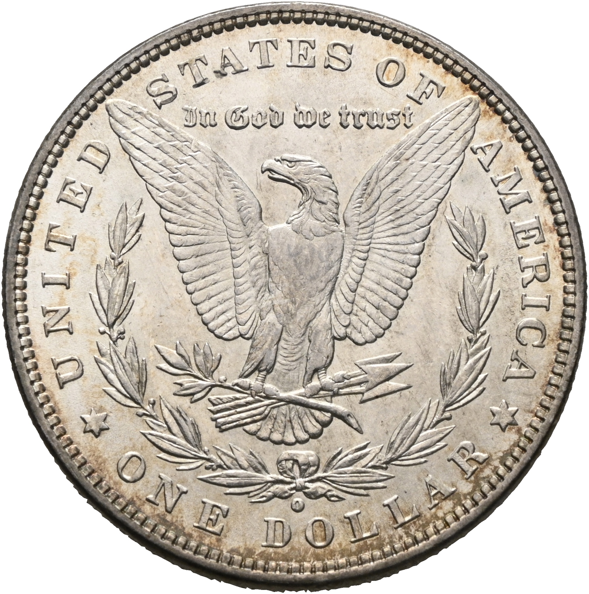 Reversen viser den amerikanske ørnen med utstrakte vinger, omgitt av laurbærkrans og nasjonale inskripsjoner. Mottoet E Pluribus Unum (“av mange, én”) viser til unionens sammensetning, mens In God We Trust ble innført på amerikanske mynter etter borgerkrigen og reflekterer samtidens religiøse og politiske strømninger.