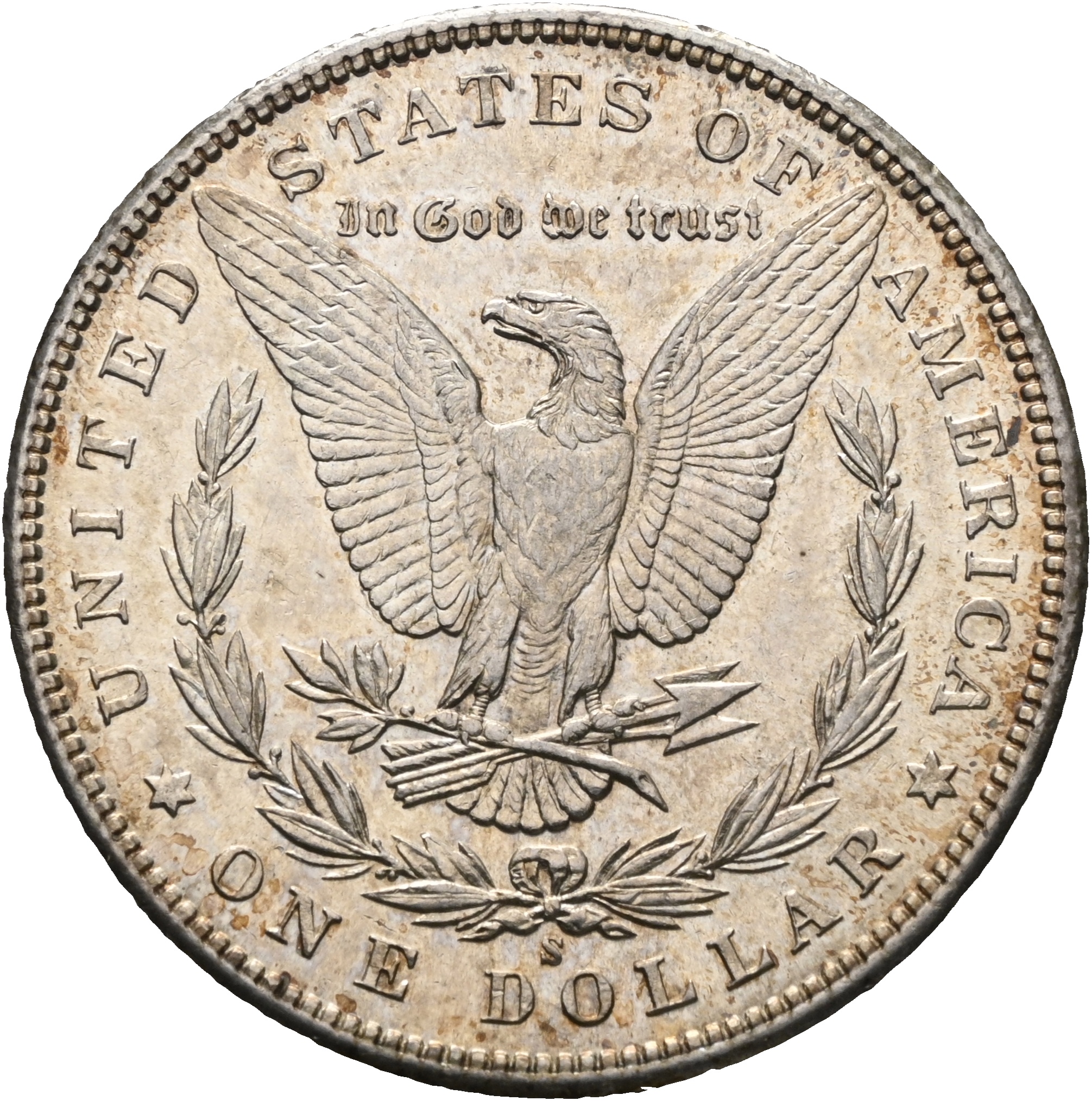 Reversen viser den amerikanske ørnen med utstrakte vinger, omgitt av laurbærkrans og nasjonale inskripsjoner. Mottoet E Pluribus Unum (“av mange, én”) viser til unionens sammensetning, mens In God We Trust ble innført på amerikanske mynter etter borgerkrigen og reflekterer samtidens religiøse og politiske strømninger.