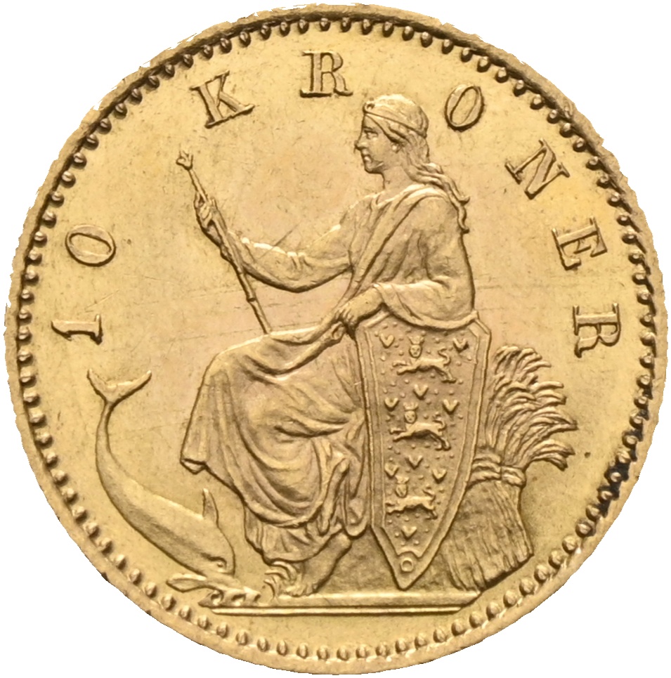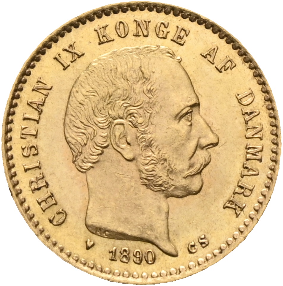 Danmark Christian IX, 1863-1906 10 kroner 1890, gull (.900) Vekt 4,48 g. Kv. 0/01 Fr. 296 / Sieg 1.1 / H.9A