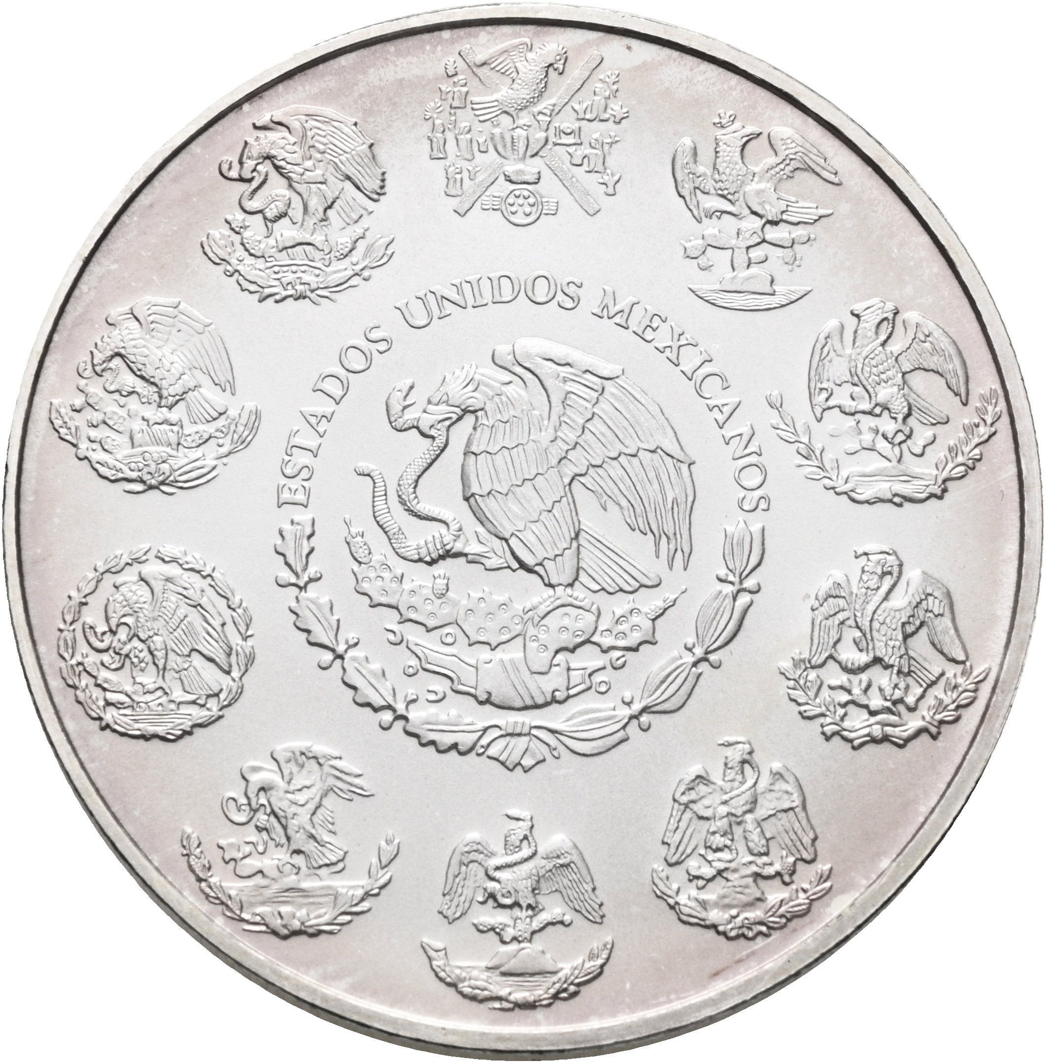Adversen viser Mexicos riksvåpen med ørnen som holder en slange i nebbet, omgitt av historiske varianter av våpenet. Reversen viser den bevingede seiersgudinnen (Ángel de la Independencia) med utstrakte vinger, foran vulkanene Popocatépetl og Iztaccíhuatl.