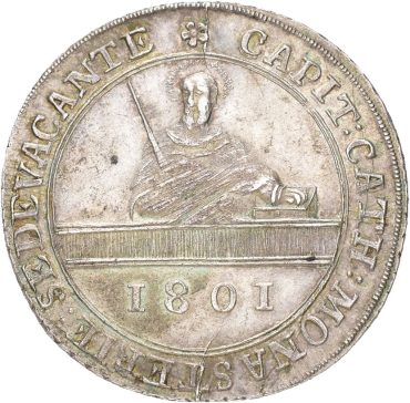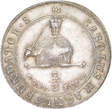 Denne 2/3 taleren fra 1801 ble preget i Clausthal, en liten tysk bergverksby som i likhet med Kongsberg levde av sølv, gruvedrift og myntpreging. Uten bergverket ville byen knapt ha eksistert, akkurat som i Kongsberg, og forbindelsen mellom disse miljøene var tett gjennom fagfolk, teknikere og gruvearbeidere. Mynten ble slått for fyrstedømmet Münster i en urolig tid da bispestolen sto tom etter biskopens død. I århundrer hadde Münster vært et kirkelig styrt område, der det nettopp var den religiøse fyrsten som hadde retten til å prege mynt. På den ene siden ser vi apostelen Paulus, kristendommens store forkynner. På den andre siden står Karl den store, den mektige keiseren som la grunnlaget for det kristne Europa. At han er avbildet her er neppe tilfeldig, for rundt denne tiden nærmet man seg også jubelårene for hans keiserdømme nær tusen år tidligere. Mynten bærer dermed både kirkelig autoritet og verdslig keisermakt i samme uttrykk. Den ble preget i et begrenset antall, trolig rundt 300 eksemplarer, og er derfor sjelden i dag. Slik blir denne lille taleren et møtepunkt mellom sølv, tro, makt og bergverk og et uventet historisk bånd mellom Clausthal og Kongsberg.
