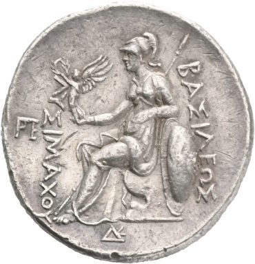 På baksiden sitter gudinnen Athena med skjold og lanse, et symbol på både visdom og krigsmakt. Her fremstår Lysimachos ikke bare som konge, men som den rettmessige videreføreren av Aleksanders verdensrike. Mynten er derfor langt mer enn et betalingsmiddel – den er et politisk manifest i sølv. Den forteller om makt, ambisjon, arverett og behovet for legitimitet i en tid da Aleksanders rike var i ferd med å bli delt mellom hans rivaler.