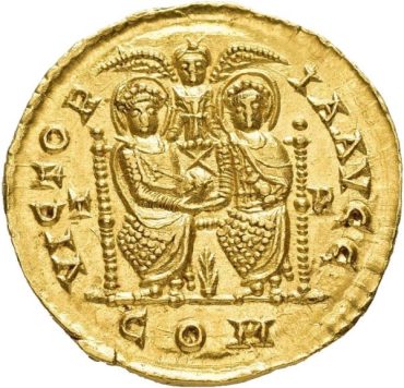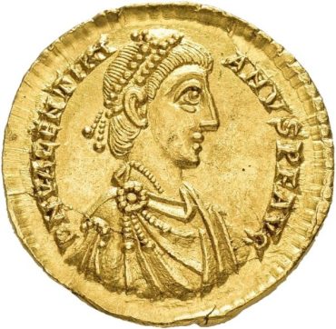 Denne gullsolidusen ble preget i Treveri – dagens Trier – mellom år 388 og 392 e.Kr., langt oppe i det nordlige hjørnet av Romerriket. Mynten bærer portrettet av Valentinian II, en keiser som kom på tronen som bare fireåring og som først regjerte sammen med sin bror Gratian og sin onkel Valens, helt til begge falt i kamp. Deretter delte han makten med Theodosius I, som styrte i øst fra Konstantinopel, mens Valentinian selv hersket i den vestlige delen av riket. Dette var en tid preget av uro: ytre trusler, indre maktspill og en stadig mer presset statsstruktur. I dette kaoset forsøkte rikets ledere å vise styrke og samhold gjennom symboler, og solidusen fra Treveri er nettopp et slikt uttrykk. På reversen står de to keiserne side om side, med seiersgudinnen Victoria bak seg som garantist for fred og stabilitet. Motivet er uvanlig i romersk myntkunst, nettopp fordi det så tydelig understreker idealet om harmoni mellom herskerne. Mer enn 1600 år senere føles budskapet like aktuelt: at selv i urolige tider kan makt deles, og enhet være rikets sterkeste våpen.